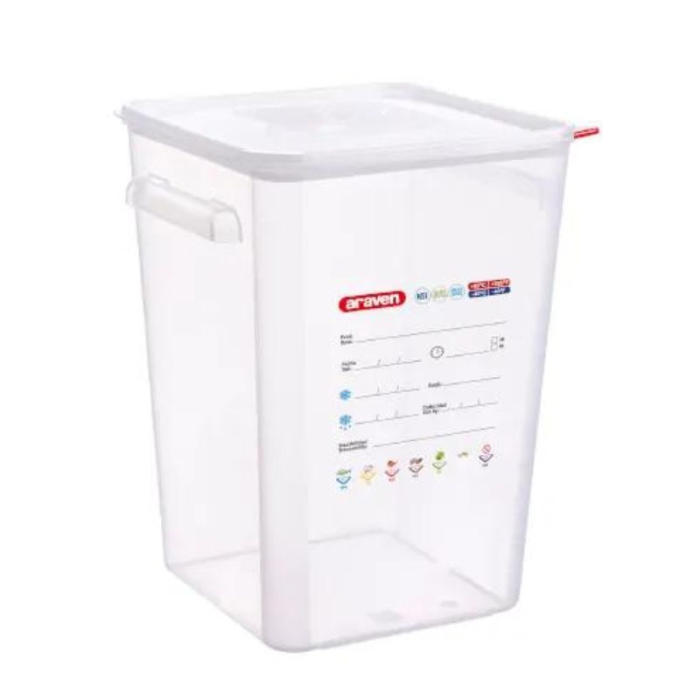 This Araven Square Foood Container & Lid holds 22 litres and is great for storing a wide range of food items in the kitchen and food prep areas. Polypropylene is one of the most popular plastics used by food professionals due to its long-lasting properties at different temperatures. It can withstand high heat and low temperatures without warping or shattering to give years of use. The air tight container allows you to store food for longer with its double air-tight seal for total protection of the food.