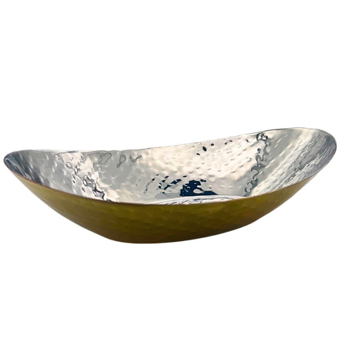 The brass plated hammered oval bread serving dish makes a great addition to tabletops and buffets. The dish measures 20cm in length and can comfortably hold a range of different breads and starch sides, from freshly baked homemade bread, to pita and naan slices. The shape of the dish is both stylish and practical, keeping the bread on the plate.