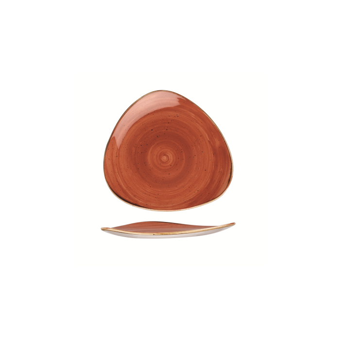 The Churchill Stonecast Spiced Orange Lotus Plate measures 10" around. The triangle shape of the plate creates an interesting background, making this plate ideal for an eye-catching tabletop food presentation. Due to the nature of the ceramic manufacturing process, every piece of Stonecast will be slightly different. This adds to the overall charm of the range and makes it more appealing to mix and match different products.