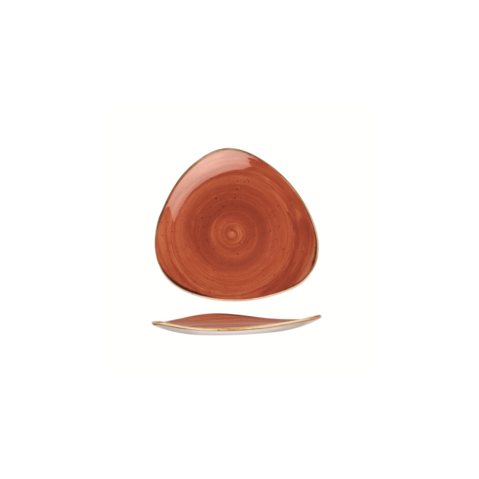 The Churchill Stonecast Spiced Orange Lotus Plate measures 7" around. The triangle shape of the plate creates an interesting background, making this plate ideal for an eye-catching tabletop food presentation. Due to the nature of the ceramic manufacturing process, every piece of Stonecast will be slightly different. This adds to the overall charm of the range and makes it more appealing to mix and match different products.