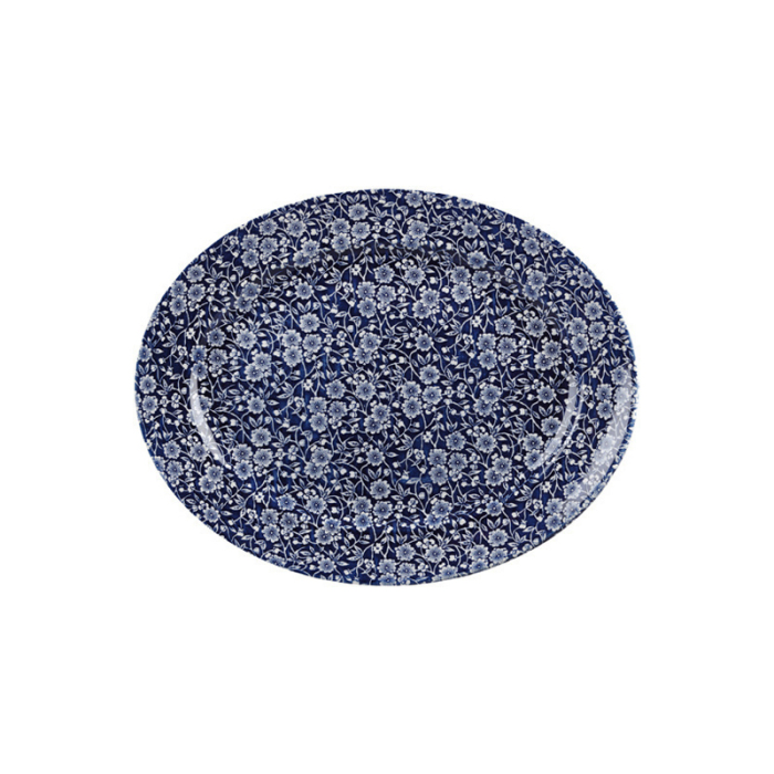 The Vintage Prints Victorian Calico Willow Classic Oval Plate is great for sharing dishes and larger meals, measuring 14.375" around. With an eye-catching dark blue floral pattern, the plate elevates the food serving and tabletop presentation. The plate has a rim around the edge, ensuring the food stays on the plate. From curries to salad, this plate would be a great addition to any hospitality venue looking for a durable and stylish plate. Calico dinnerware is trendy and works for a variety of locations.