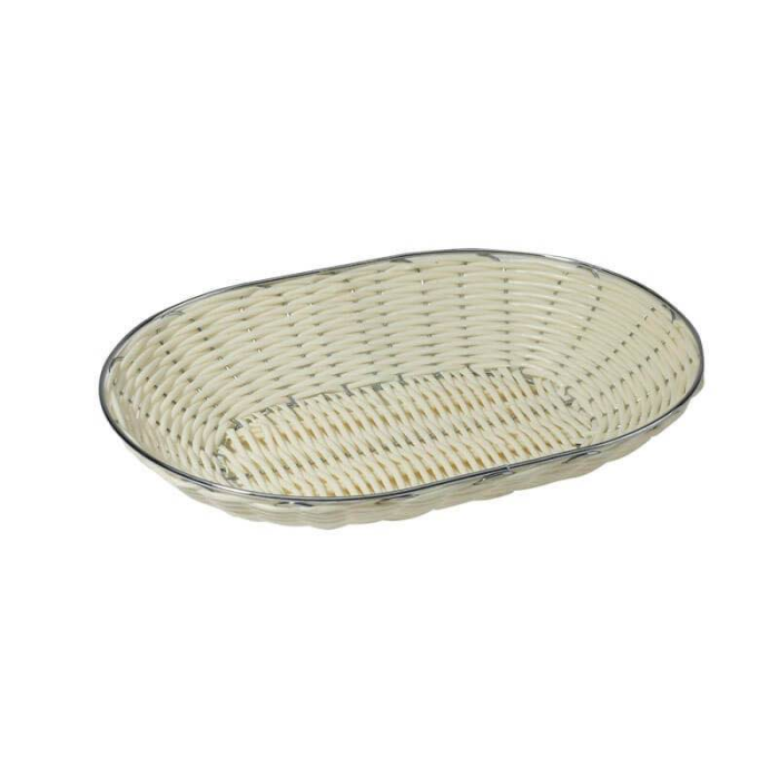 Crafted with attention to detail, the plastic woven design brings a timeless charm while ensuring durability and easy maintenance. The metal rim enhances the basket's visual appeal, creating a stylish contrast. Whether used for serving bread or appetisers, the Deluxe Oval Plastic Woven Basket seamlessly combines practicality and aesthetics.