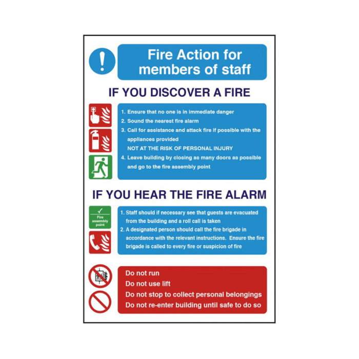 Fire Action Notices are compulsory signs that MUST be displayed throughout your premises to help make sure the correct steps are taken should a fire be discovered. They provide crucial instructions for staff, guests and visitors during a fire emergency, ensuring everyone knows the essential actions to take; from raising alarms to your fire assembly point locations. This sign clearly explains to staff what they should do in the event of a fire.