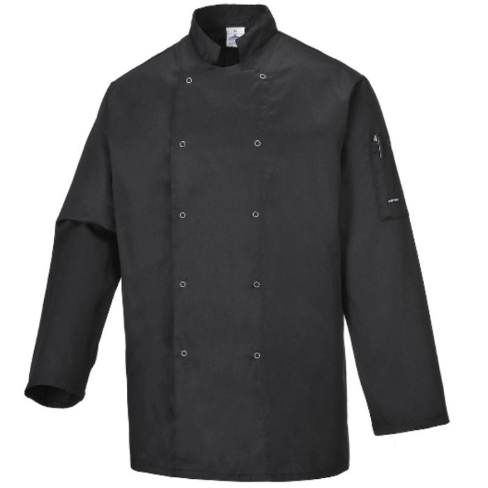 The Portwest Suffolk Chef's Jacket Long Sleeve Black X Large is a modern and stylish take on the traditional chef’s jacket. The long retractable sleeves offer extra protection from any splashes or spills that could cause harm or stain. The material is non-shrinking to ensure that this style maintains its shape wash after wash