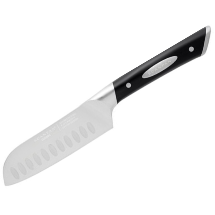 The Scanpan Classic 12.5cm Santoku Knife is ideal for cutting paper thin slices and dicing. The knife's blade has a scalloped edge to prevent food from clinging to the knife, which helps cut the finest of slices.