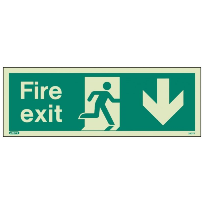 The Self Adhesive Fire Exit Arrow Down Sign Photoluminescent makes it clear where the fire exits are located. Having fire exits clearly signposted is necessary for public buildings and ensures safety procedures are followed. Signs should not be fixed to doors or sited where they may be obscured by open doors. This sign complies with BS 5499-2:1986 Fire safety signs, notices and graphic symbols.