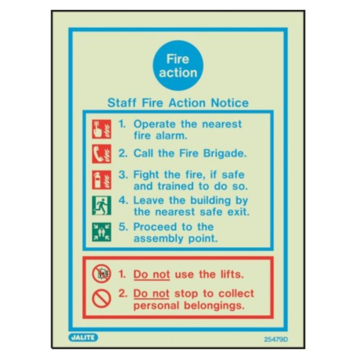 Fire safety signs are an ideal way of informing staff the actions to take in case of fire. Includes what to do if you discover a fire, if you hear the fire alarm and what not to do. This fire action sign informs staff of the steps they need to take in case of a fire.